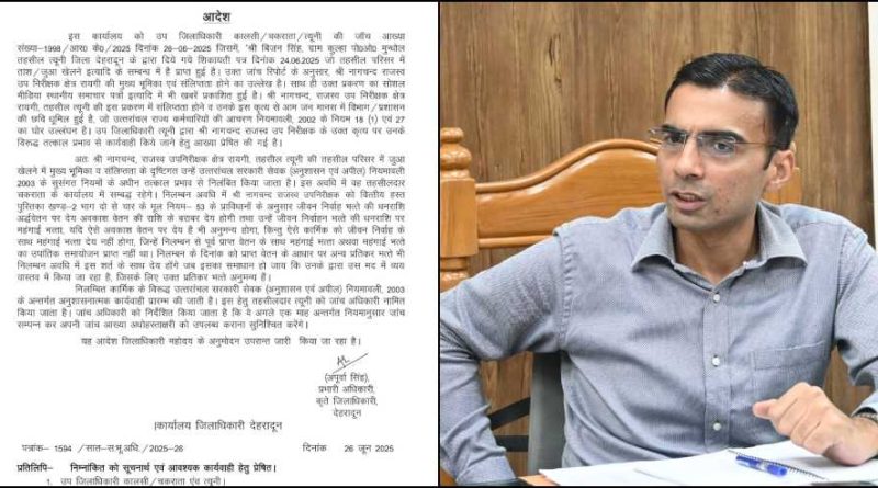 जिलाधिकारी, देहरादून सविन बंसल ने जानकारी दी कि SDM कालसी, चकराता और त्यूनी से प्राप्त जांच रिपोर्ट के आधार पर त्यूनी तहसील के रायगी क्षेत्र के राजस्व उप निरीक्षक नागचंद के खिलाफ कार्रवाई की गई है। उत्तराखंड राज्य कर्मचारियों की आचरण नियमावली का उल्लंघन करने के आरोप में उन्हें तत्काल प्रभाव से निलंबित कर दिया गया है। साथ ही, निलंबन की अवधि में राजस्व उप निरीक्षक रायगी को तहसीलदार चकराता के कार्यालय में सम्बद्ध किया गया है। डीएम ने तहसीलदार त्यूनी को जांच अधिकारी नियुक्त करते हुए इस मामले में विस्तृत जांच के निर्देश दिए हैं। उन्होंने परिसर में जुआ खेल रहे अन्य कर्मचारियों की पहचान करने और दोषी पाए जाने पर निलंबित करने के भी निर्देश दिए हैं।